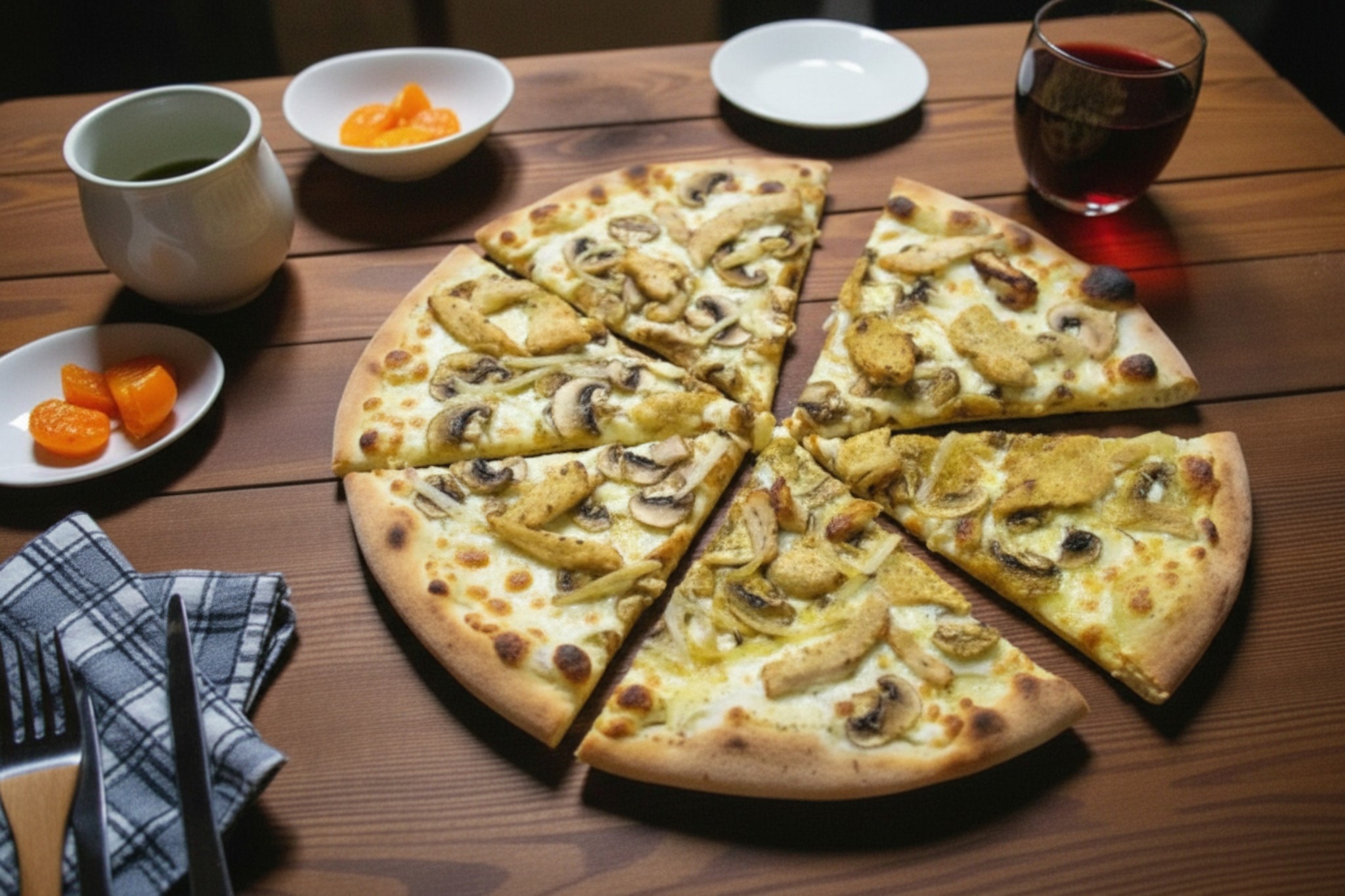 Base crème, mozzarella, oignons , poulet, origan, champignon, curry jaune