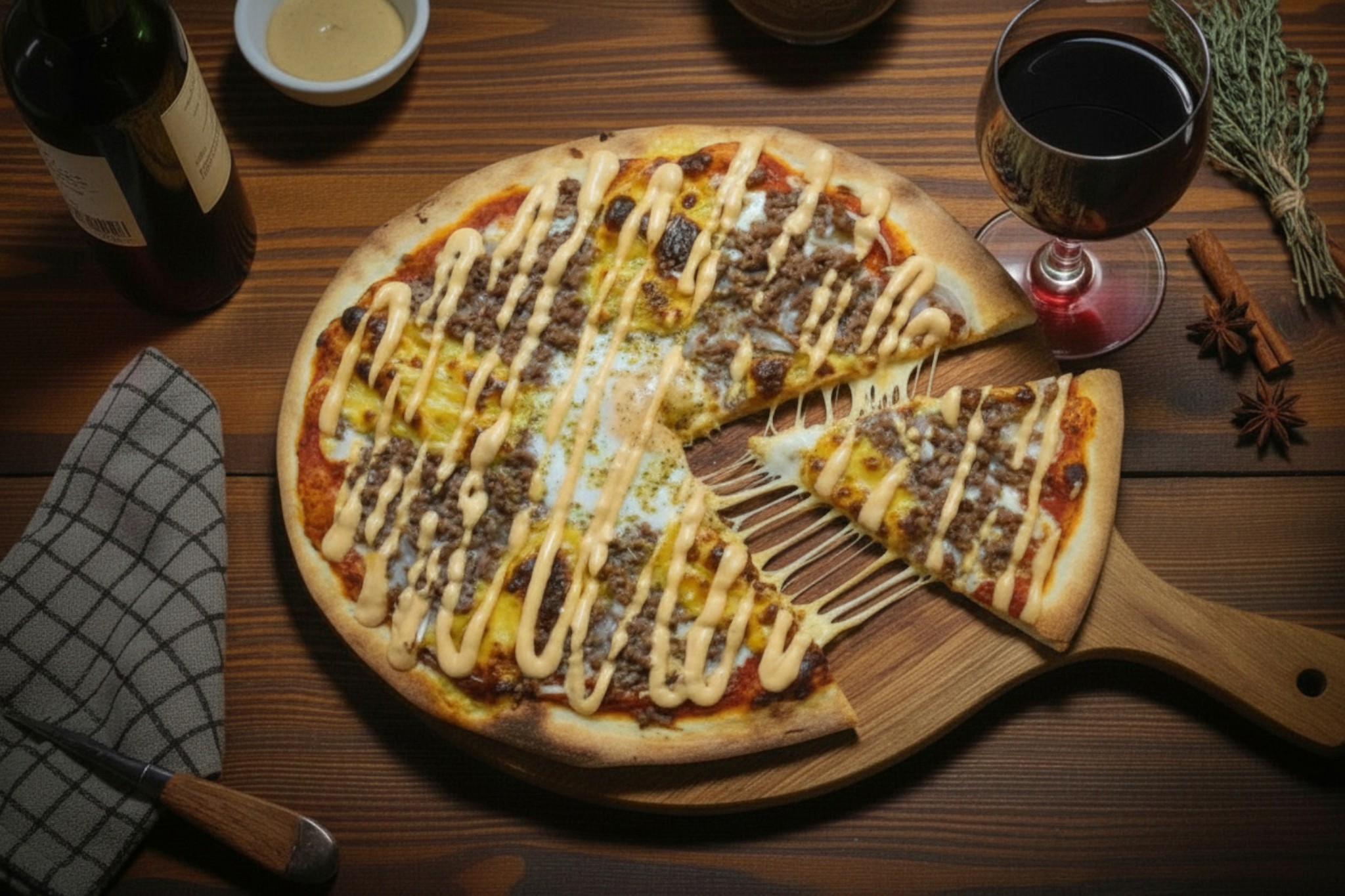 Base tomate, mozzarella, boeuf haché, oignons , cheddar, oeuf, origan, sauce burger
