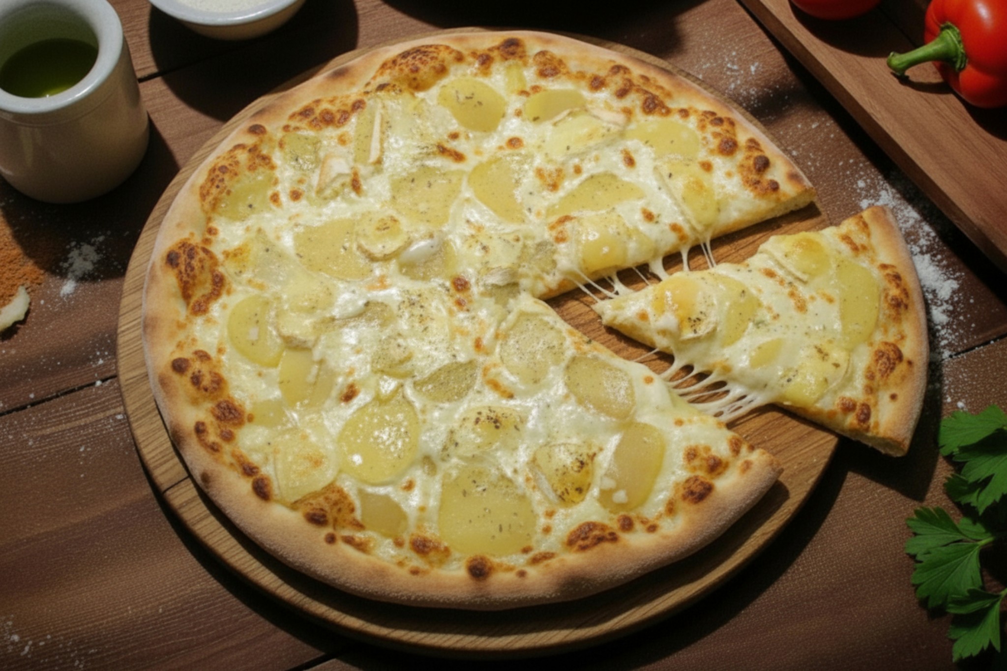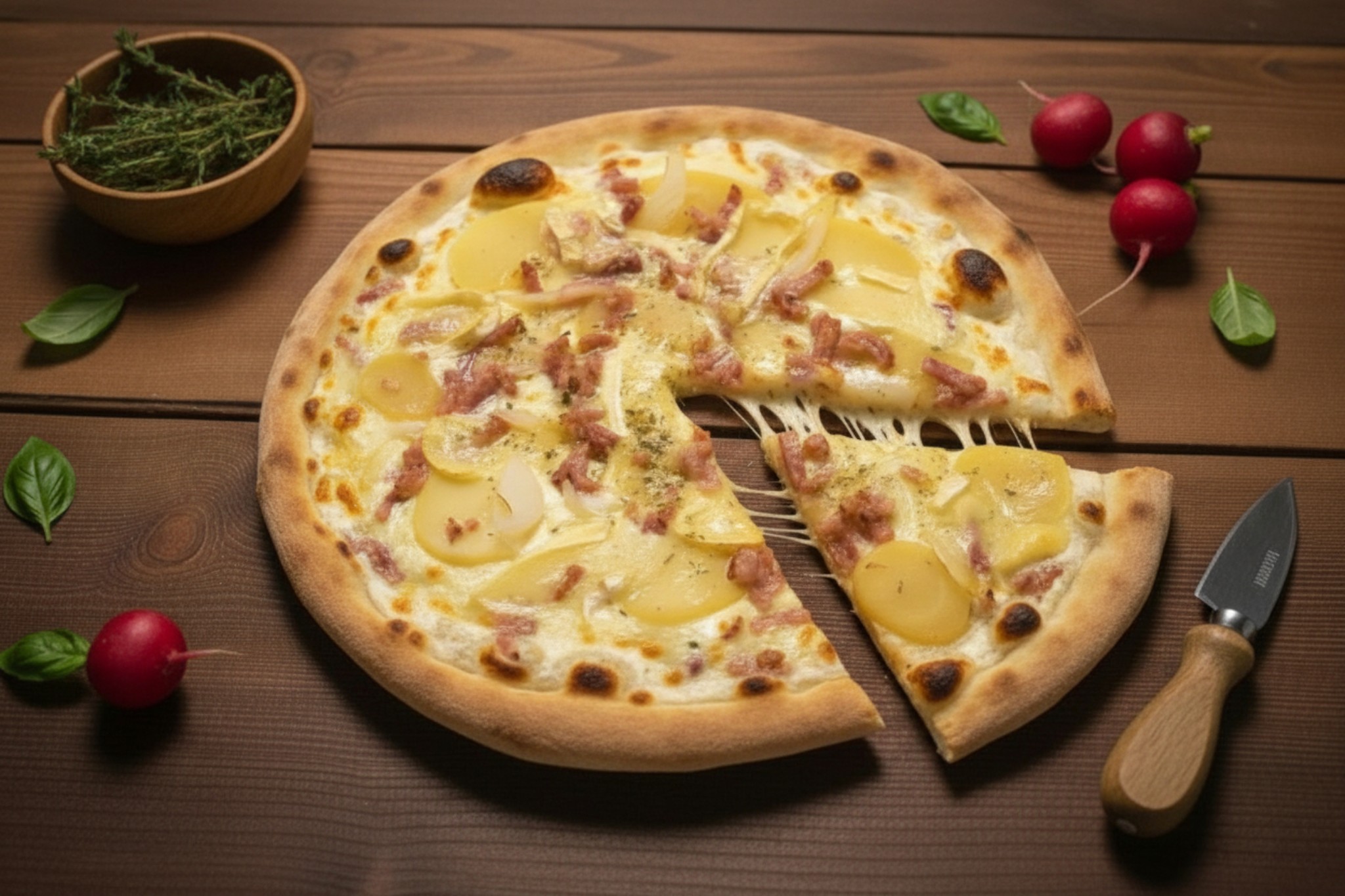 Base crème, mozzarella, reblochon, pomme de terre, ail, origan