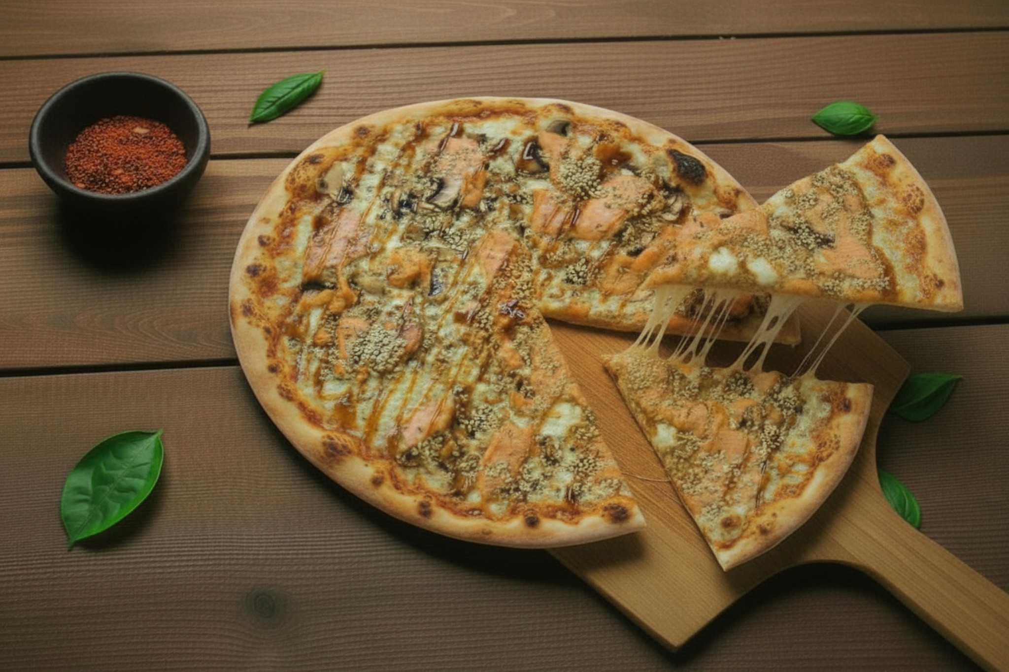 Base crème, mozzarella, saumon fumé, champignon, sesame, sauce terryaki