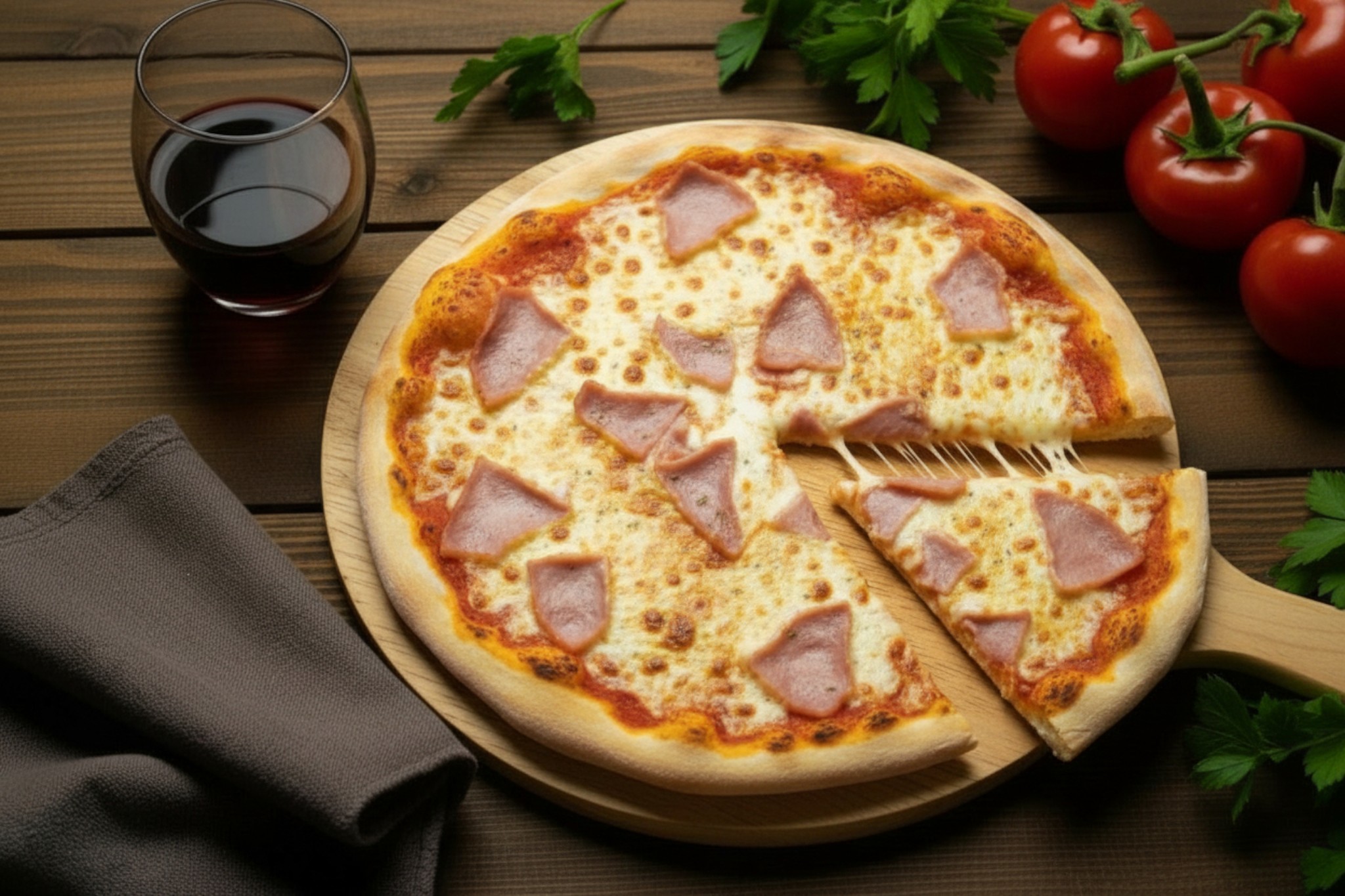 Base tomate, mozzarella, jambon de pays, parmesan, roquette, huile olive basilic, origan