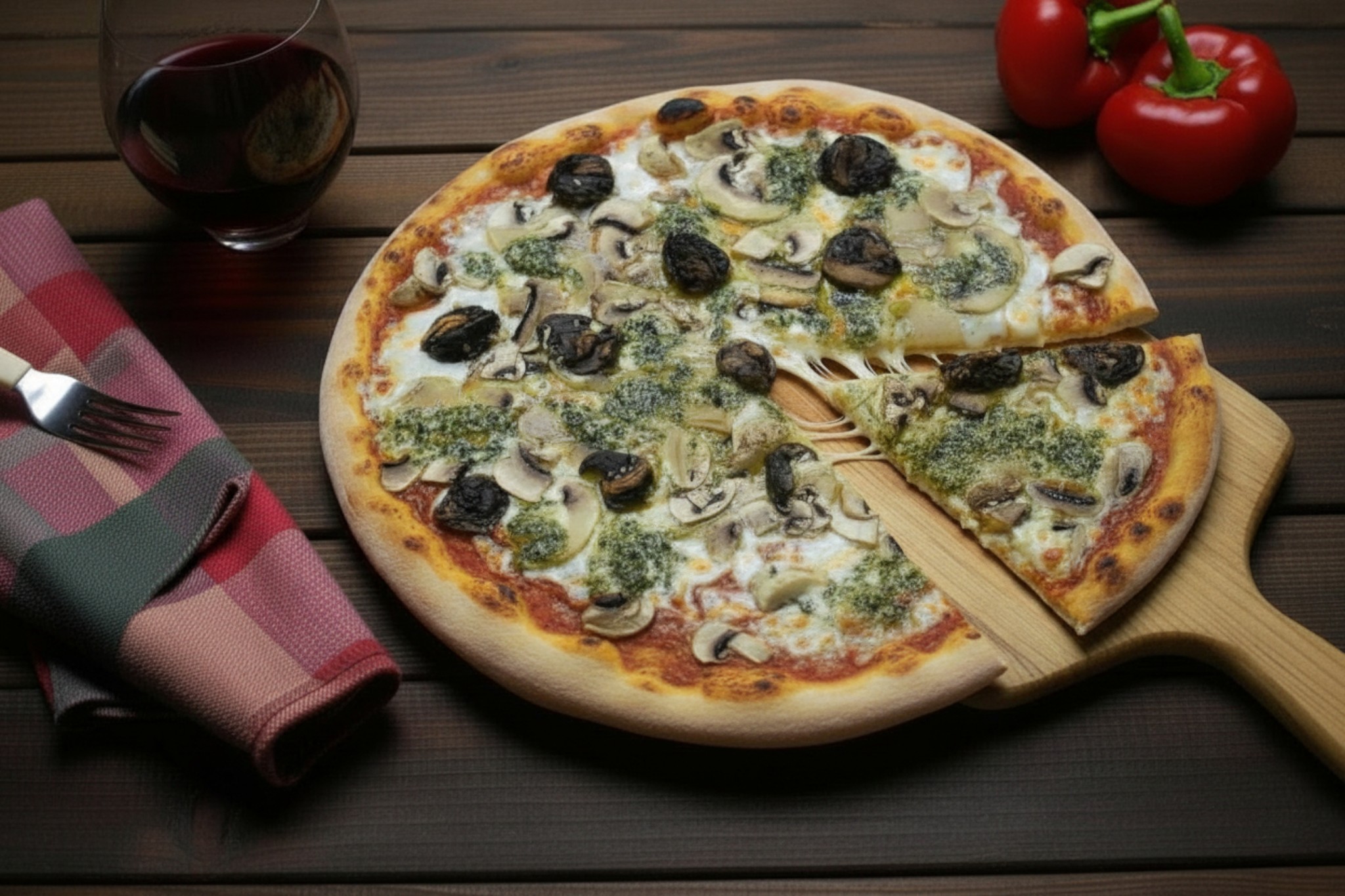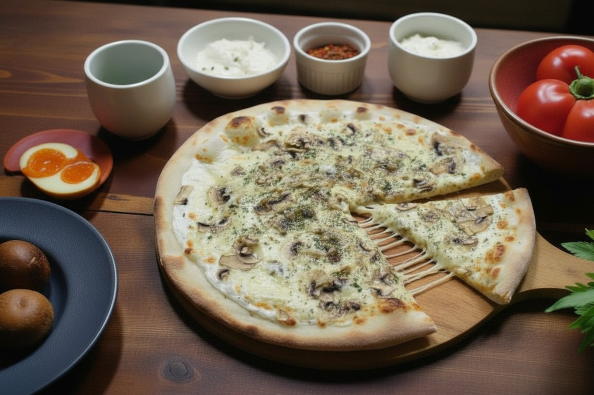 Base crème, mozzarella, champignon, ail, parmesan, huile de truffe, persil