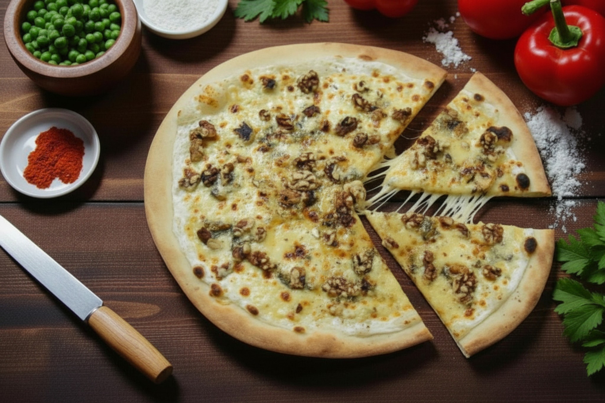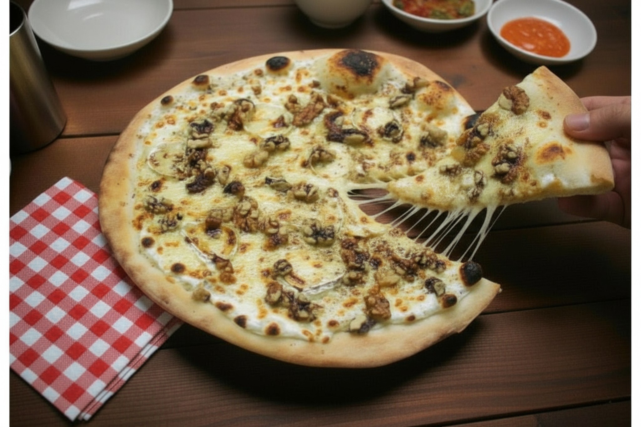 Base crème, mozzarella, miel, noix, gorgonzola, origan
