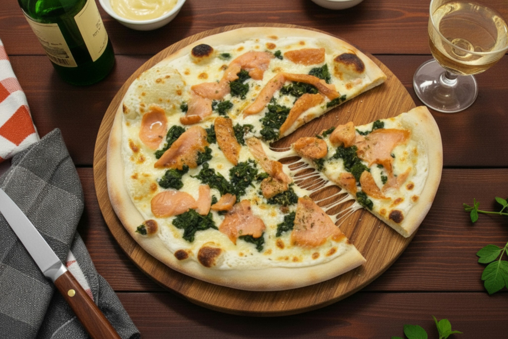 Base crème, mozzarella, epinards, saumon fumé, origan, huile de truffe