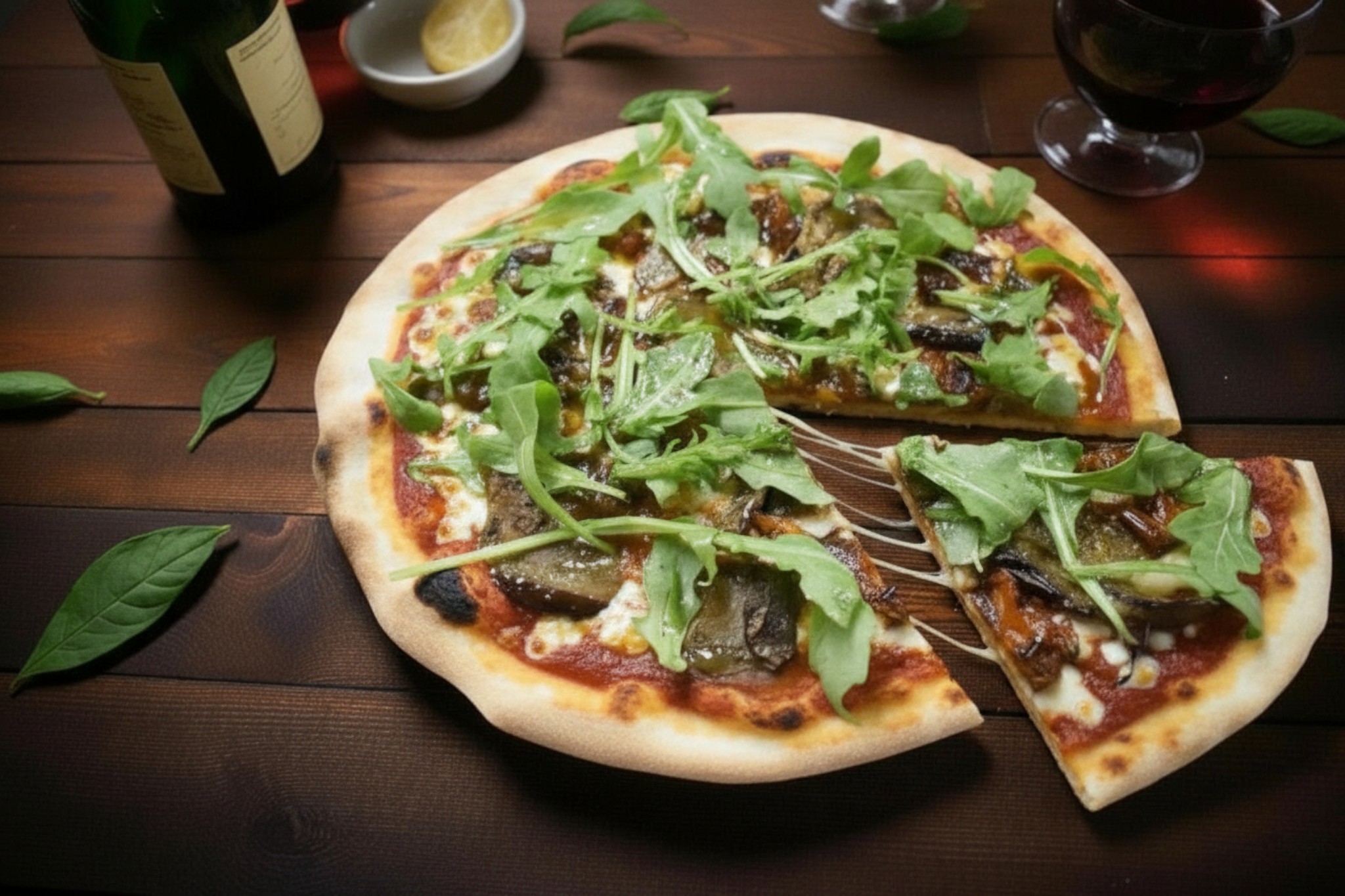 Base tomate, mozzarella, tomates séchées, roquette, origan, huile olive basilic, aubergines grillées, chutney de figues