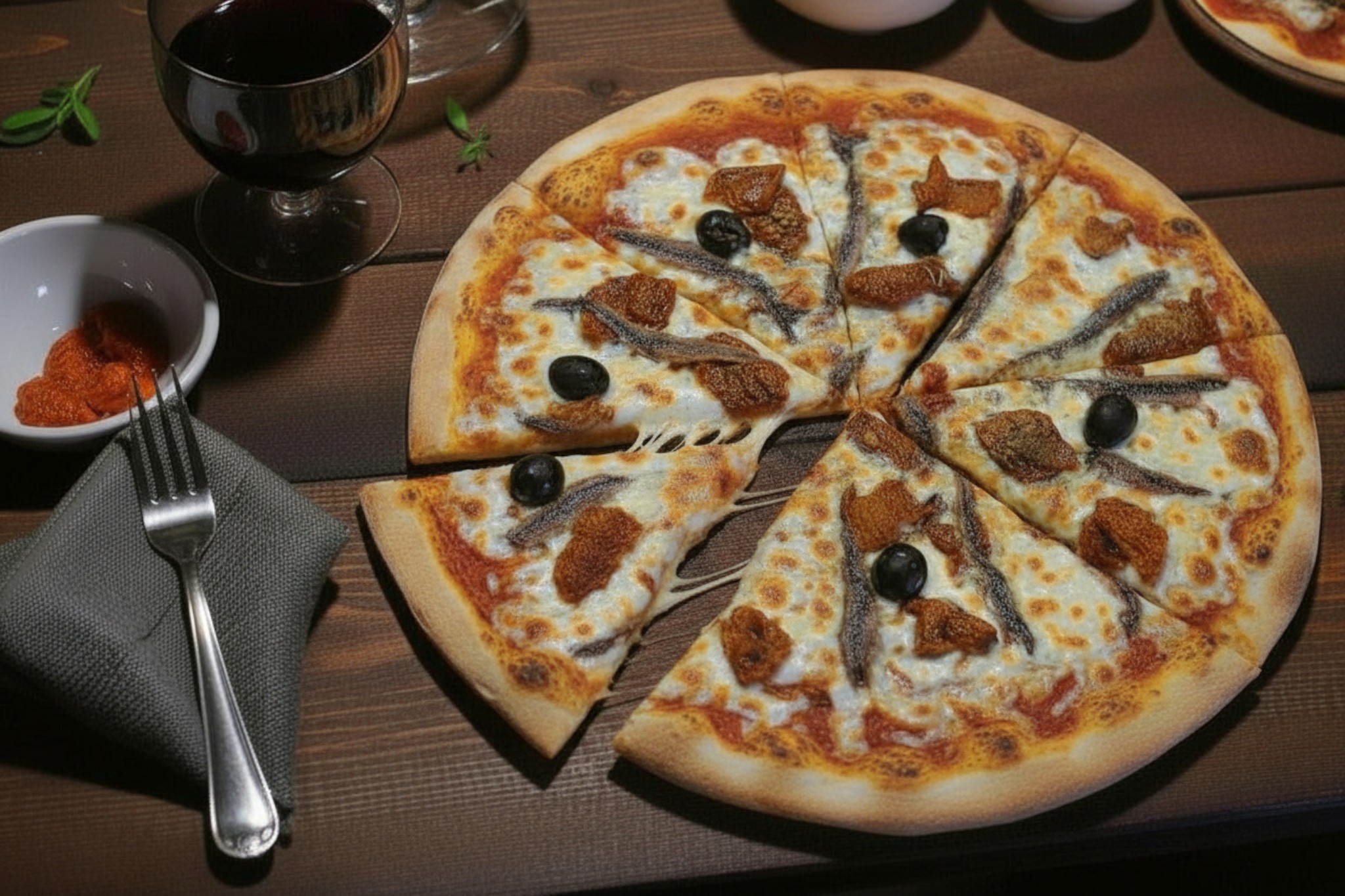 Base tomate, mozzarella, anchois, tomates séchées, olives, origan
