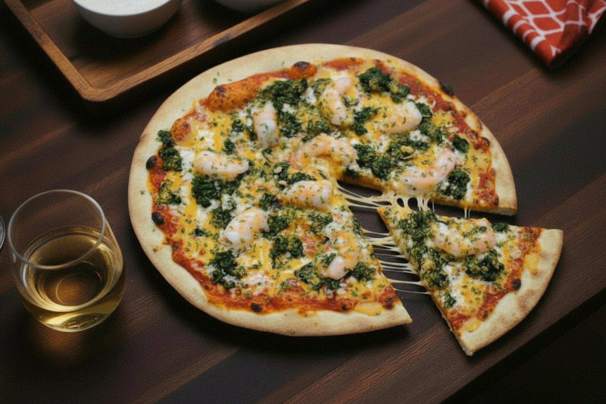 Base tomate, mozzarella, crevettes, ail, lait coco curry rouge, epinards, persil