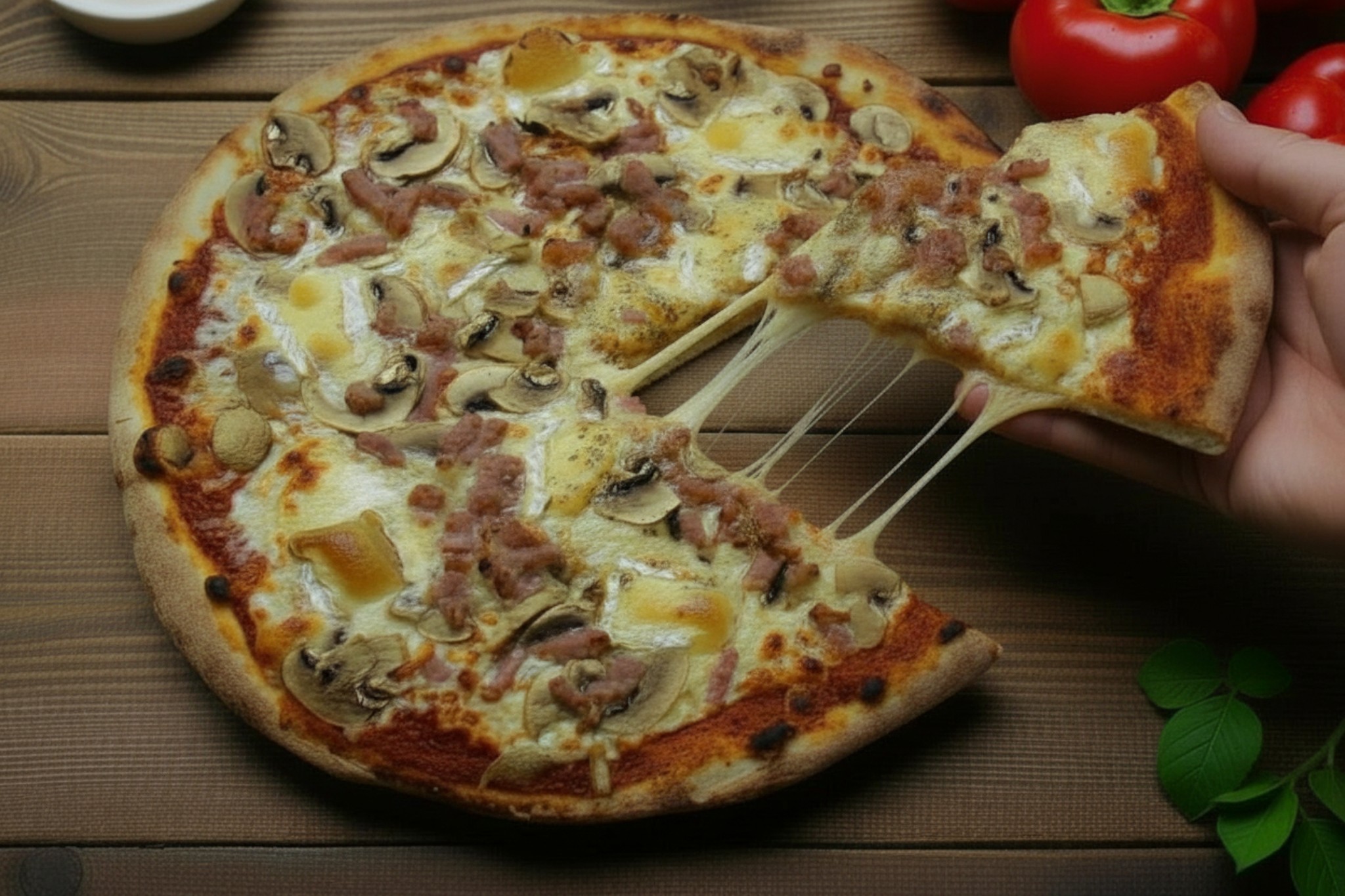 Base tomate, mozzarella, lardons, champignon, camembert, origan