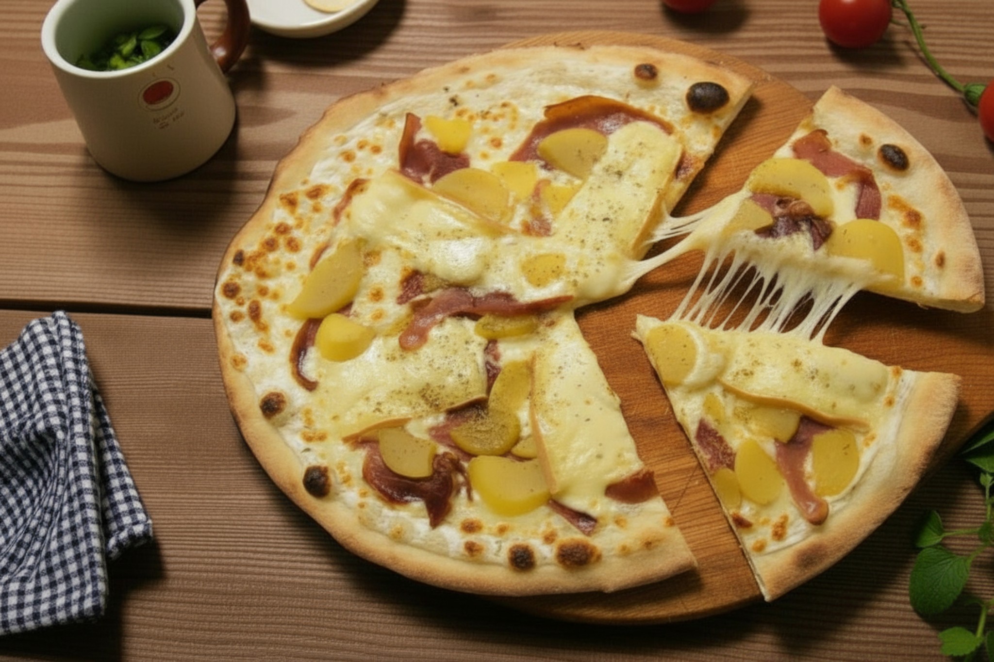 Base crème, mozzarella, jambon de pays, pomme de terre, fromage à raclette, origan