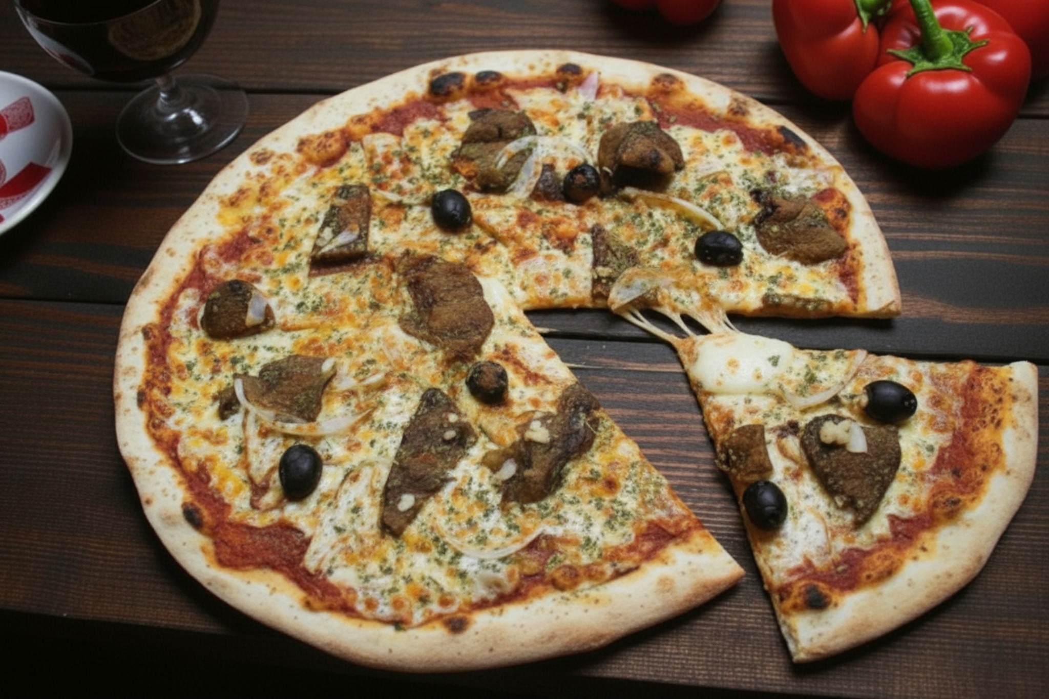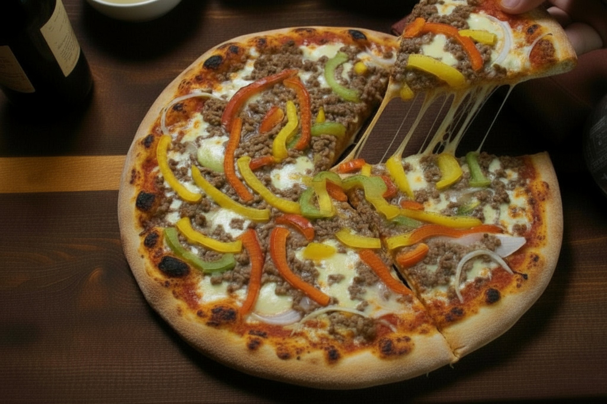 Base tomate, mozzarella, boeuf haché, poivrons, oignons , origan