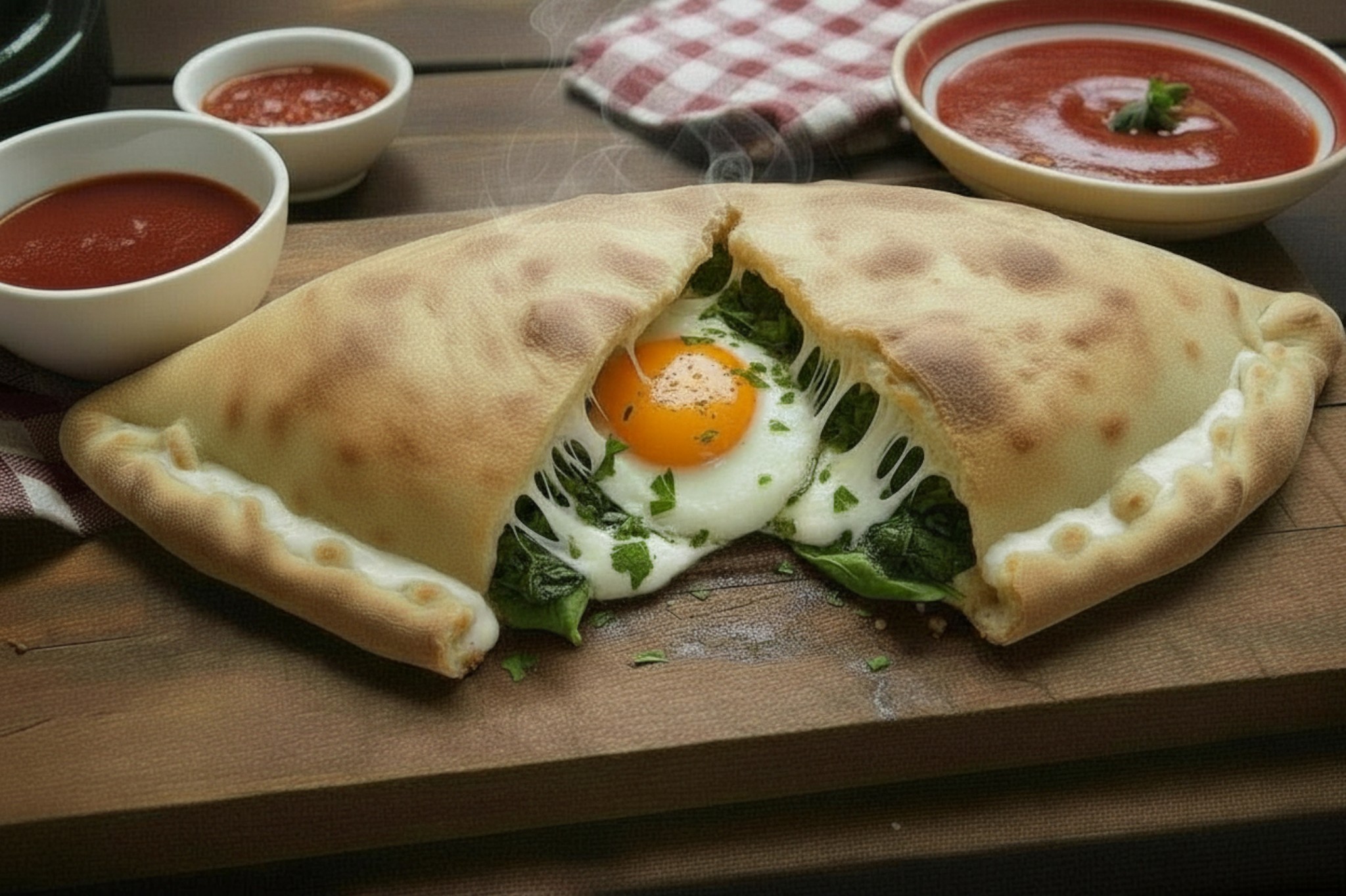 Base crème, mozzarella, origan, oeuf, epinards, ail