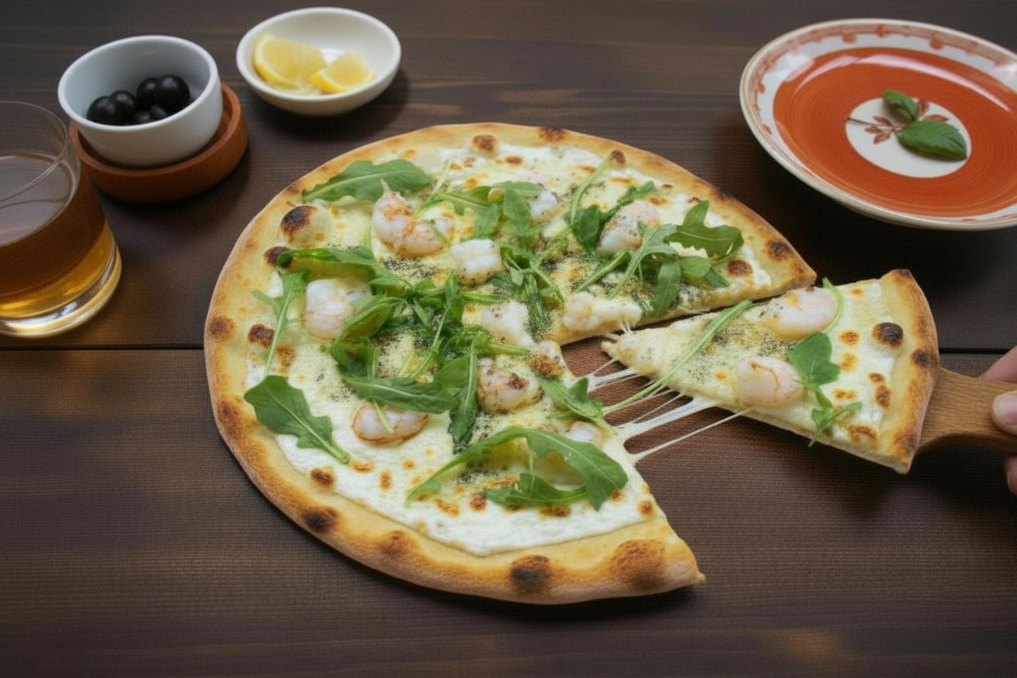 Base crème, mozzarella, crevettes, origan, roquette, beurre d'ail