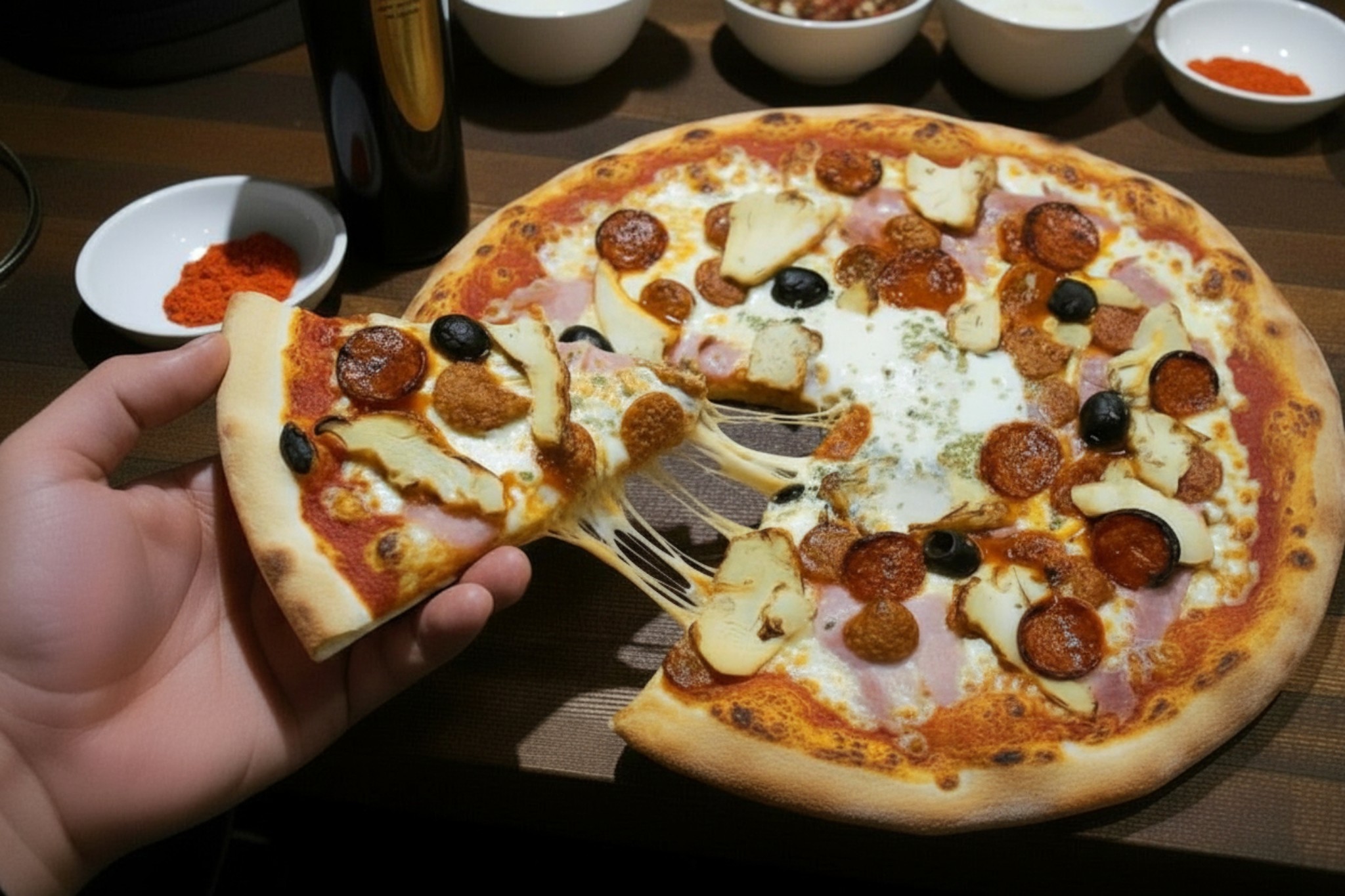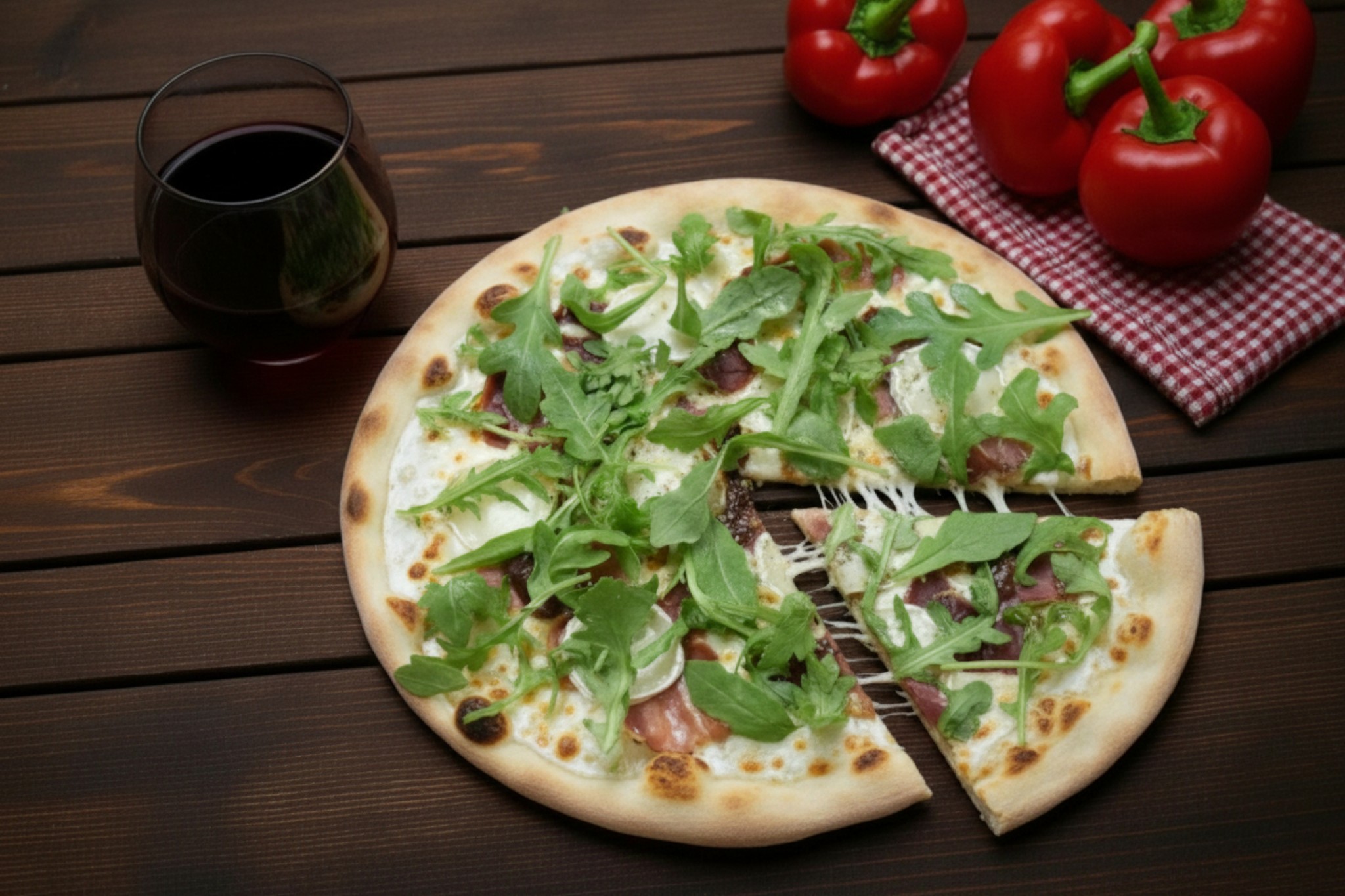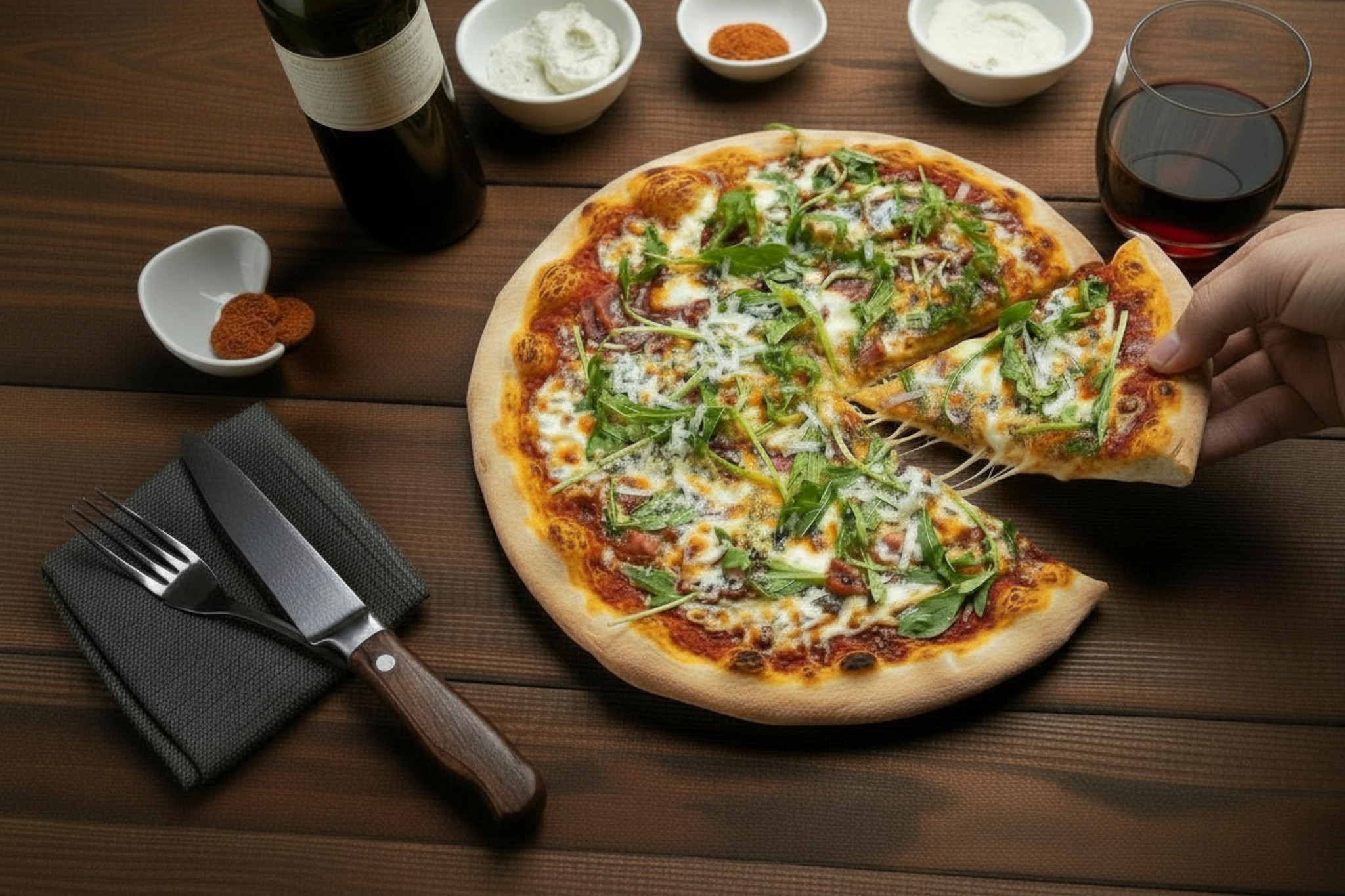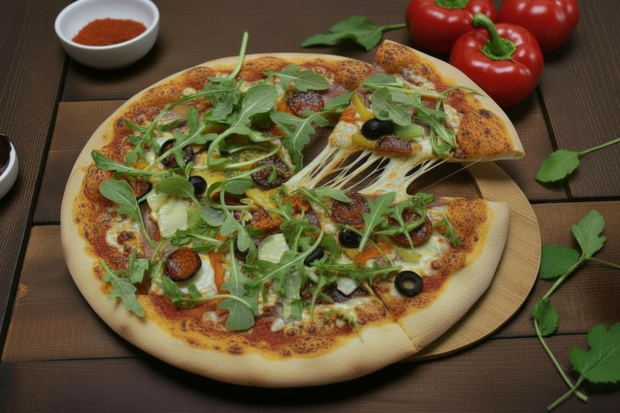 Base tomate, mozzarella, poivrons, roquette, olives, jambon de pays, chorizo, coeurs d'artichaut