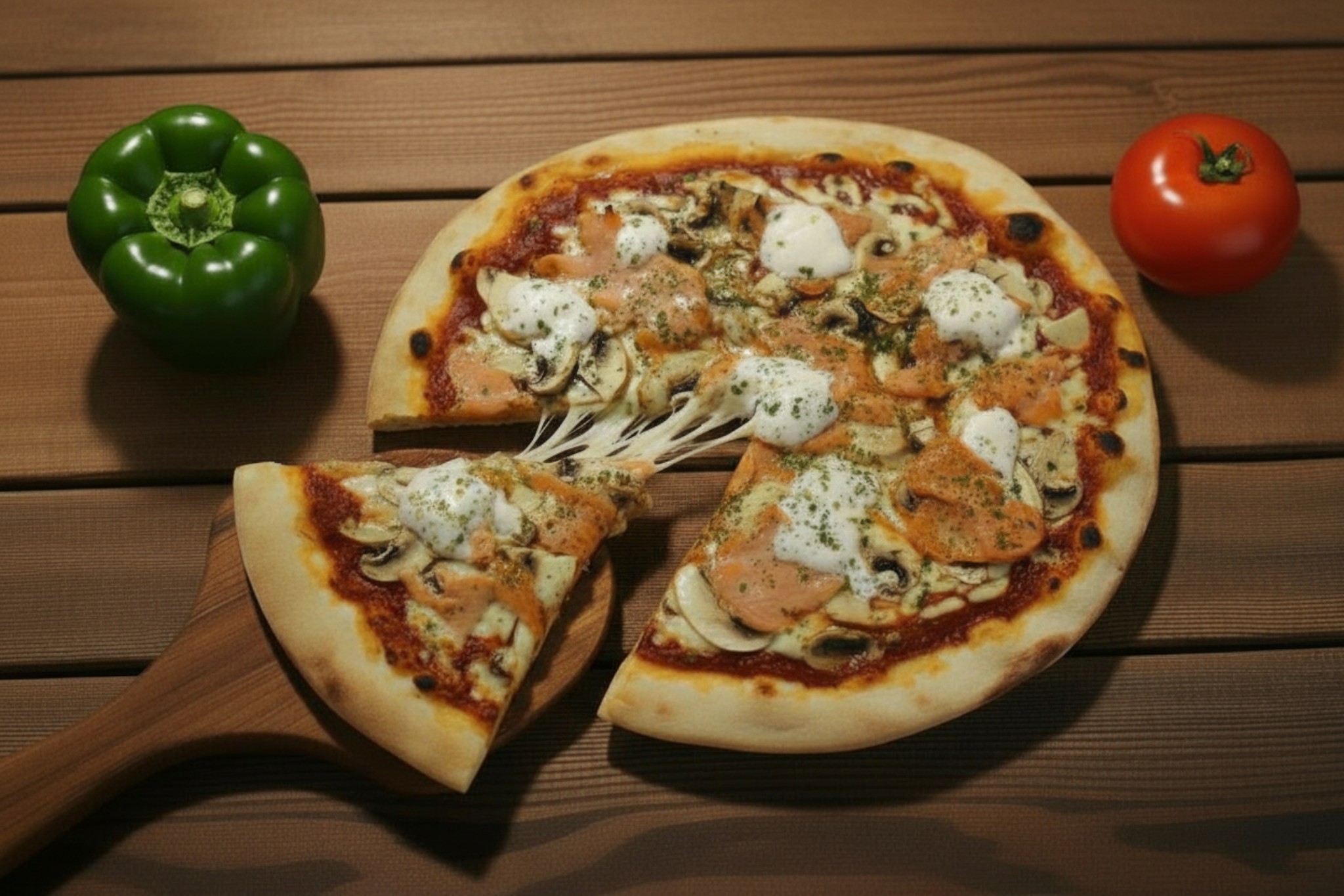 Base tomate, mozzarella, saumon fumé, champignon, crème fraiche, origan, citron, persil