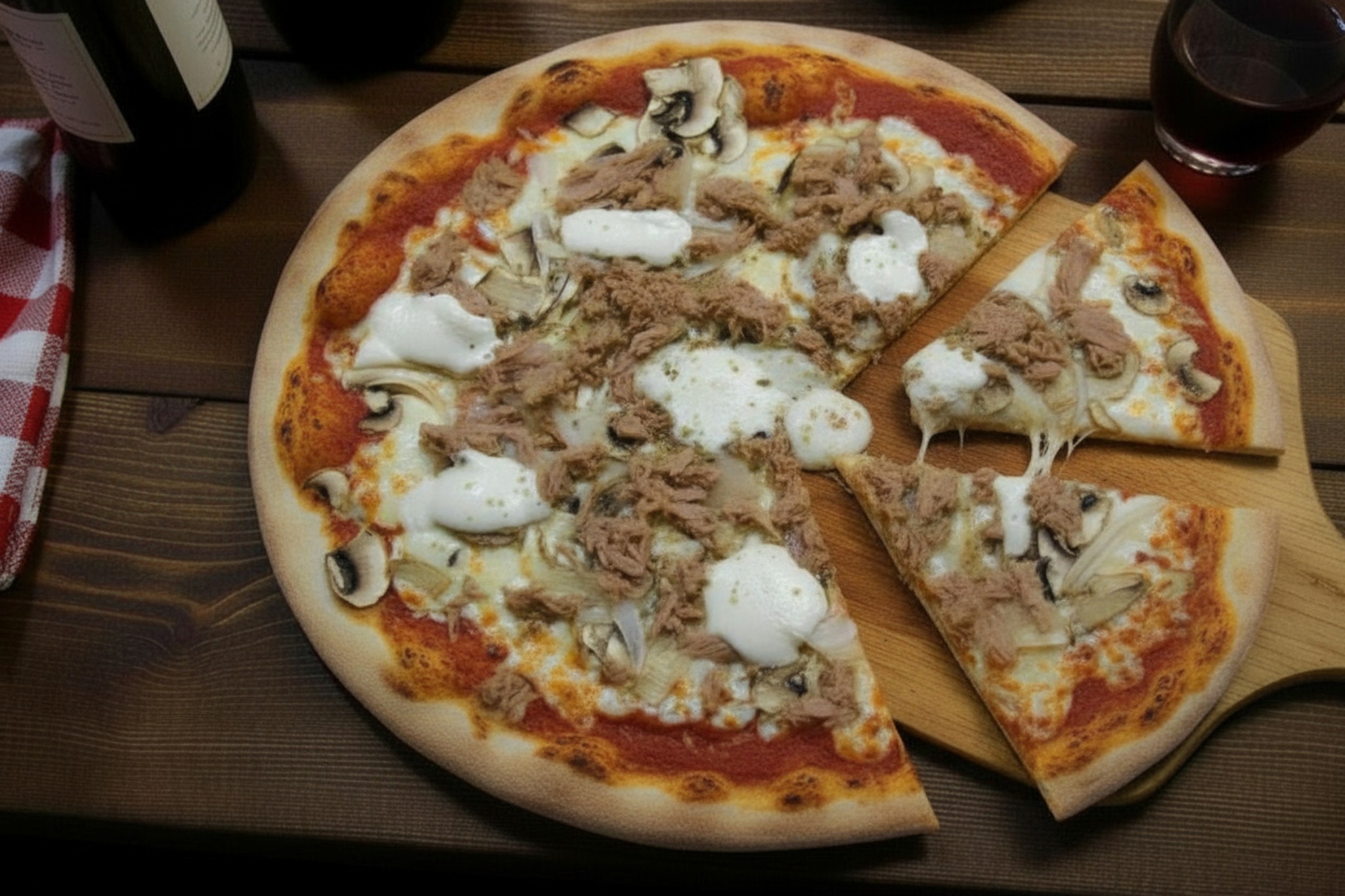 Base tomate, mozzarella, thon, oignons , champignon, origan, crème fraiche