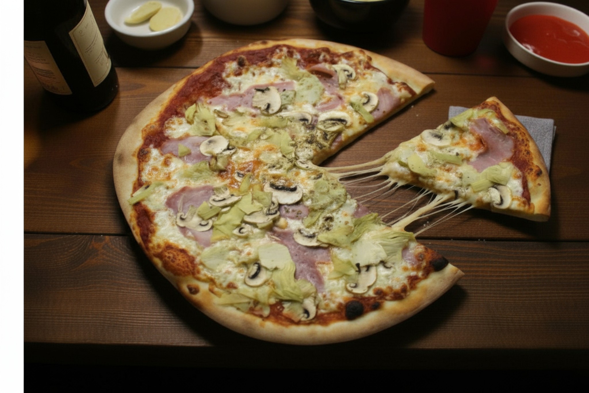 Base tomate, mozzarella, jambon , champignon, coeurs d'artichaut, origan