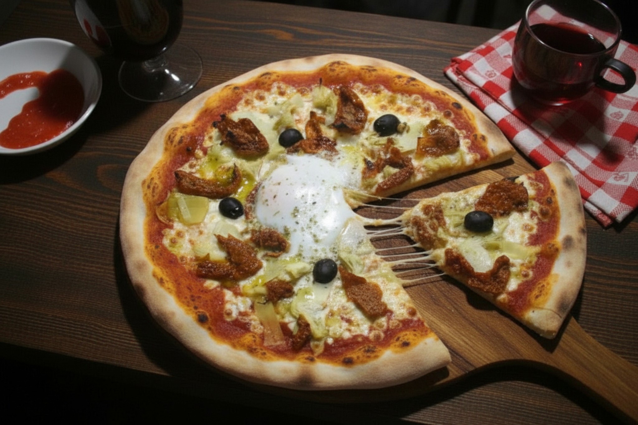 Base tomate, mozzarella, coeurs d'artichaut, tomates séchées, oeuf, olives, origan, huile olive basilic