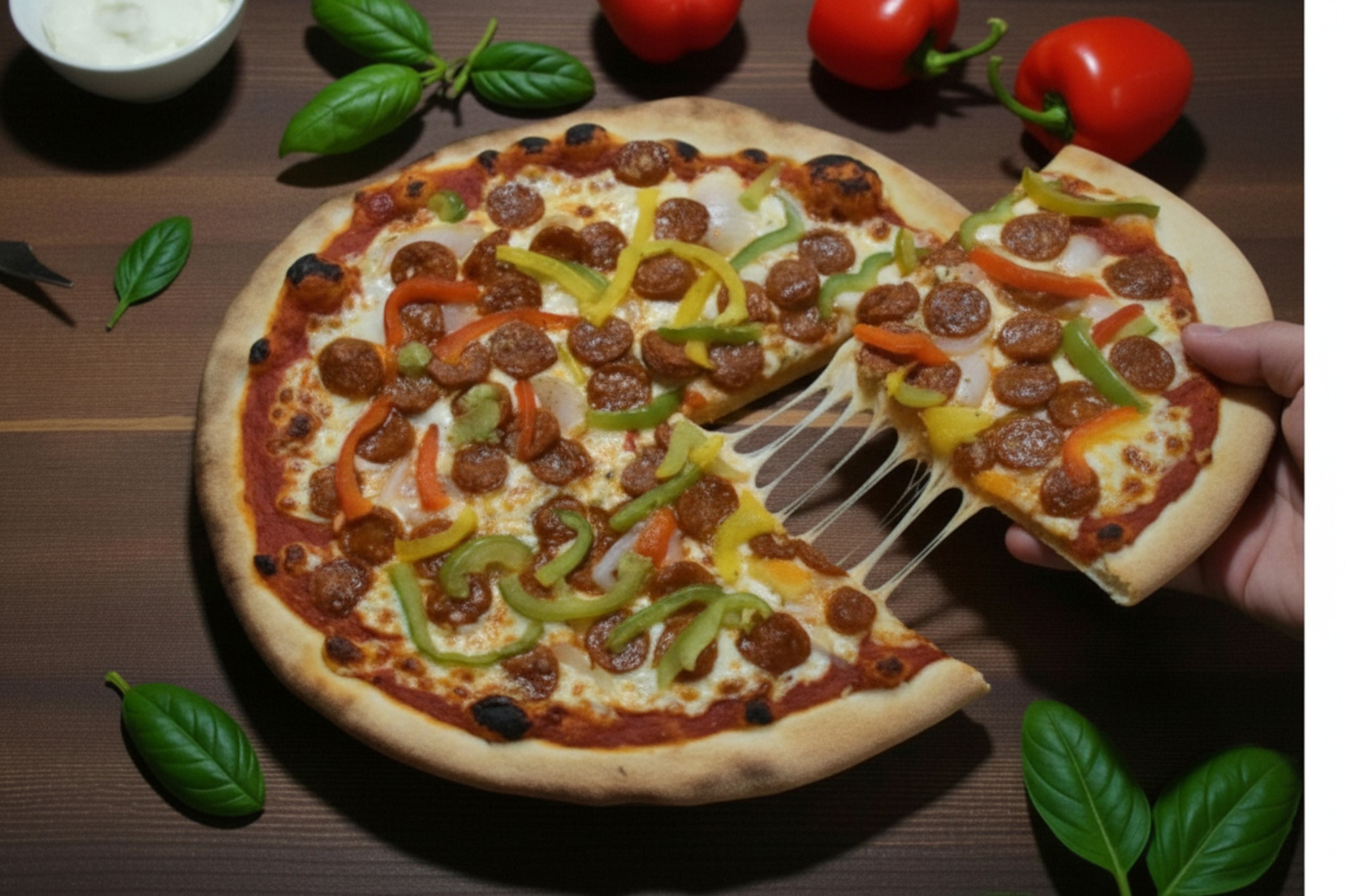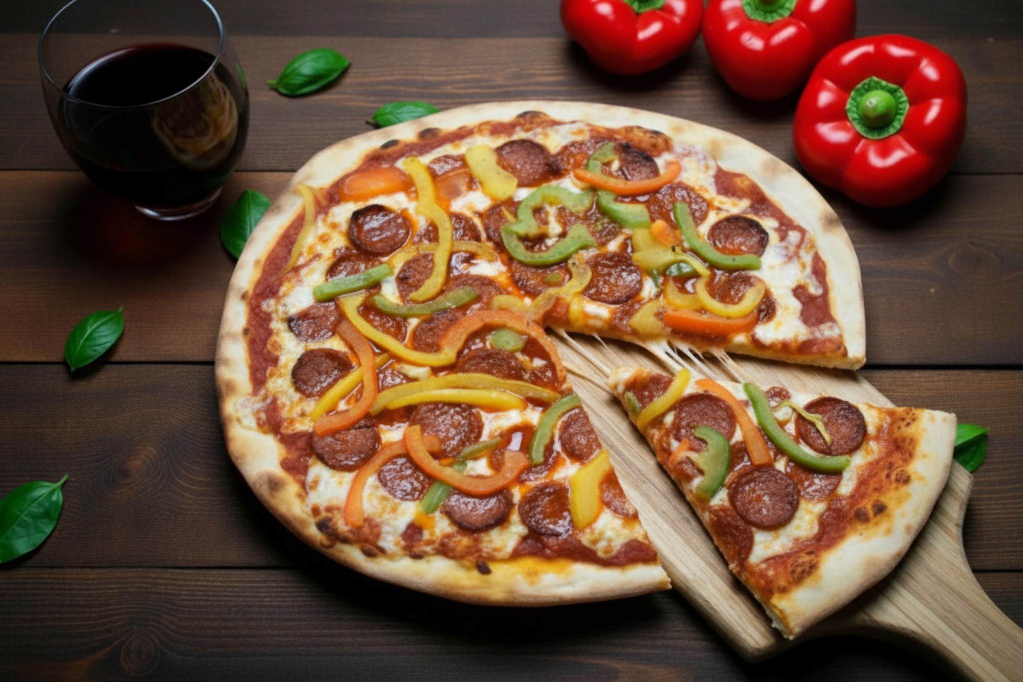 Base tomate épicée, mozzarella, chorizo, poivrons, origan