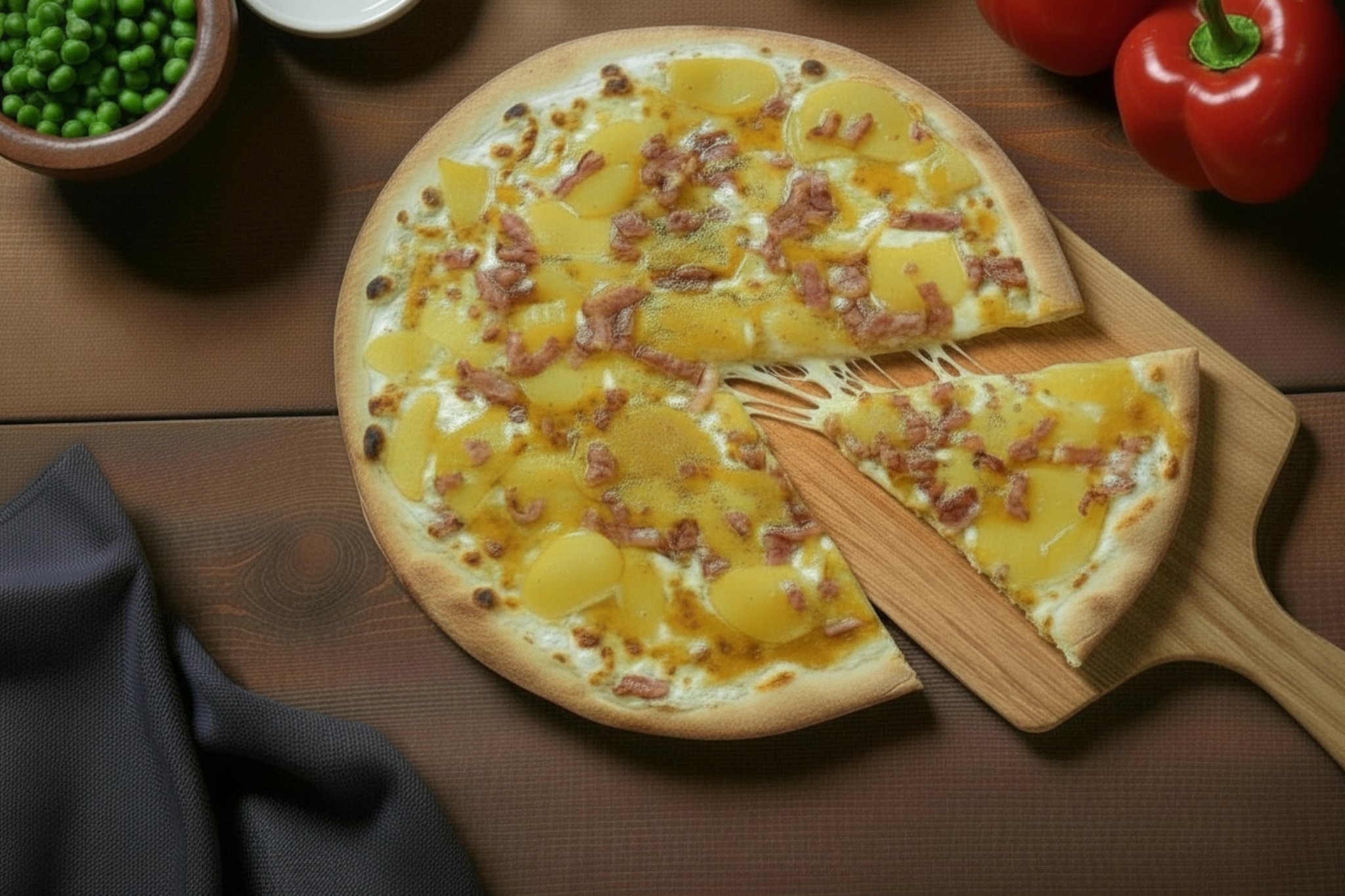 Base crème, mozzarella, lardons, pomme de terre, sirop d'érable